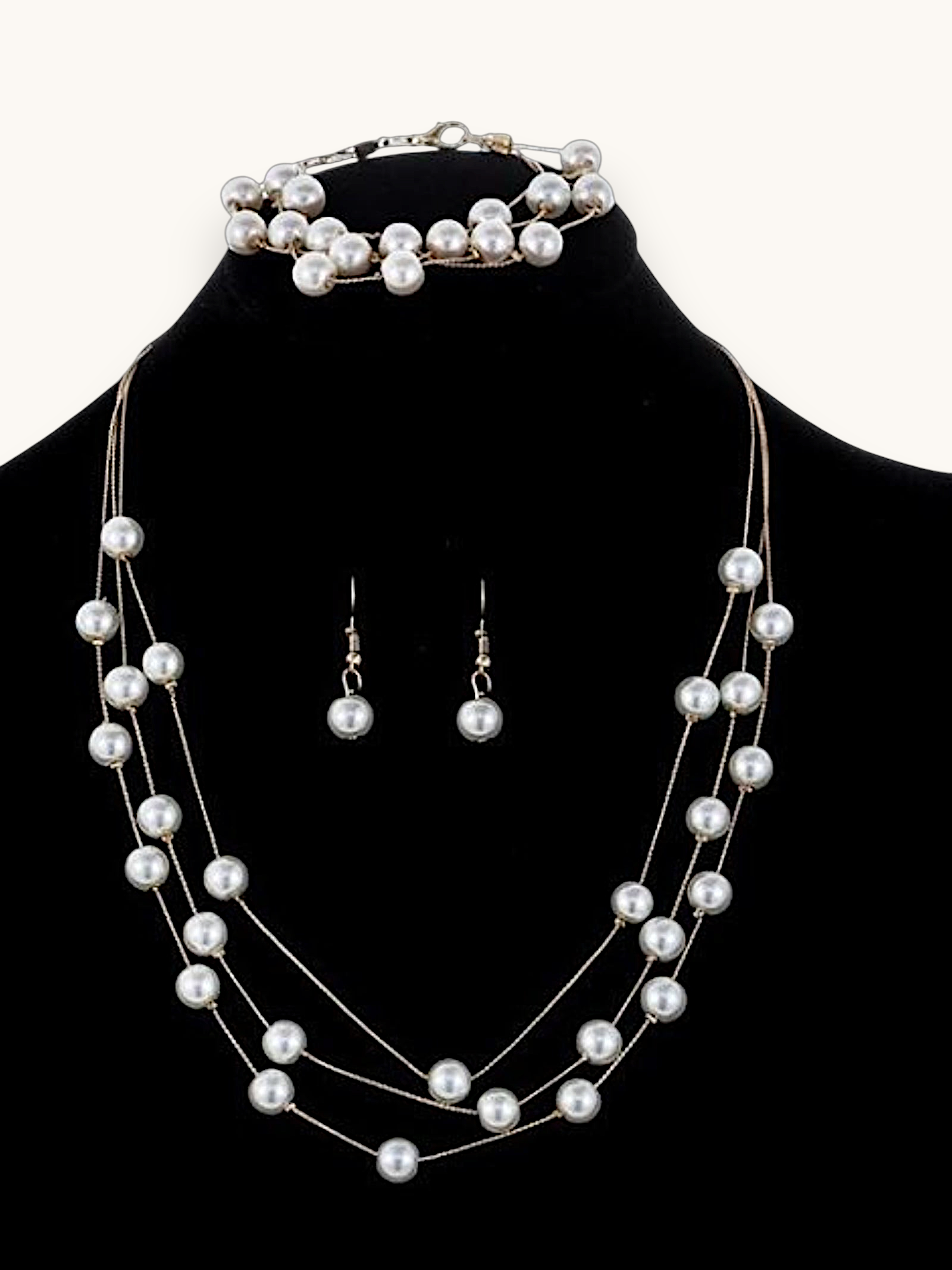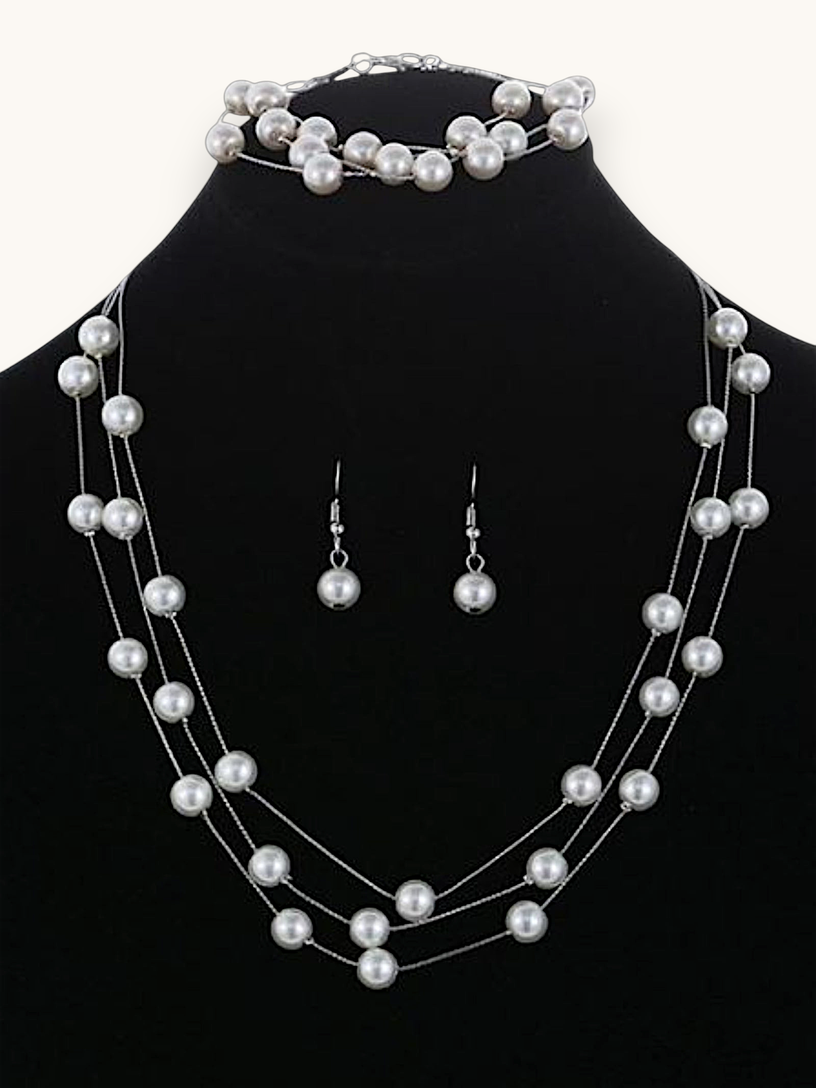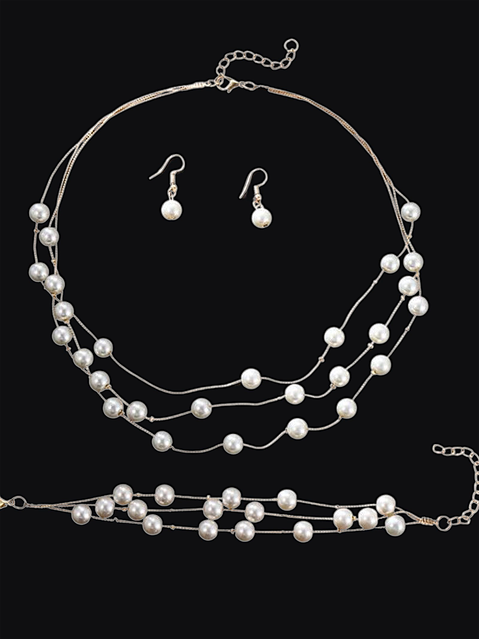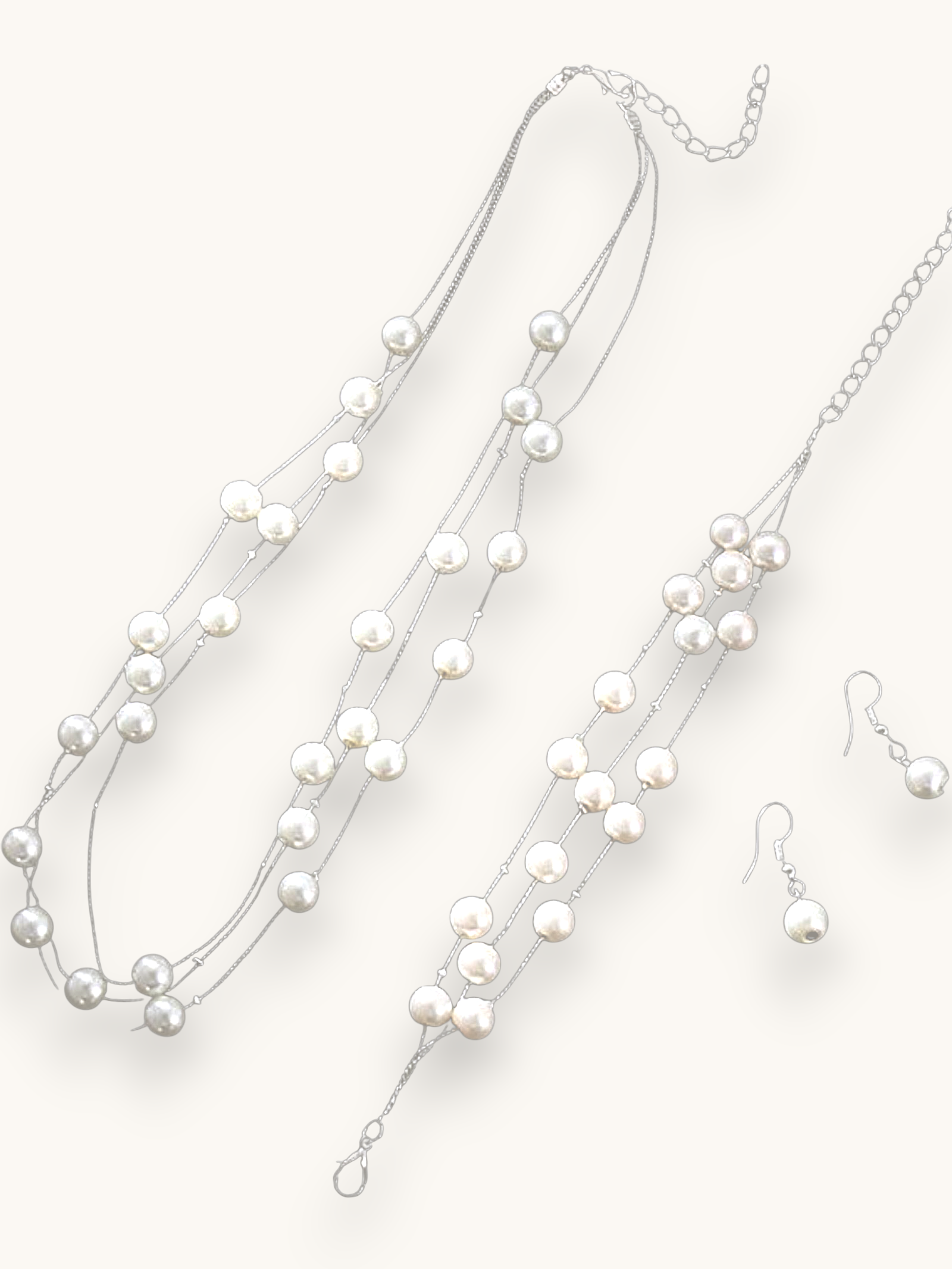 Tai prabangus ir subtilus aksesuarų komplektas, skirtas nuotakai ar ypatingoms progoms. Rinkinį sudaro auskarai, apyrankė ir koljė, dekoruoti baltais perlais bei skaidriais dekoratyviniais kristalais. Šie elementai šviesoje subtiliai žaižaruoja ir suteikia įvaizdžiui prabangos bei romantiško žavesio.