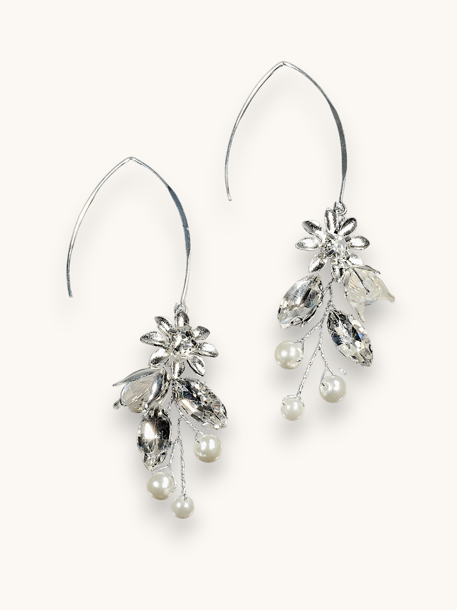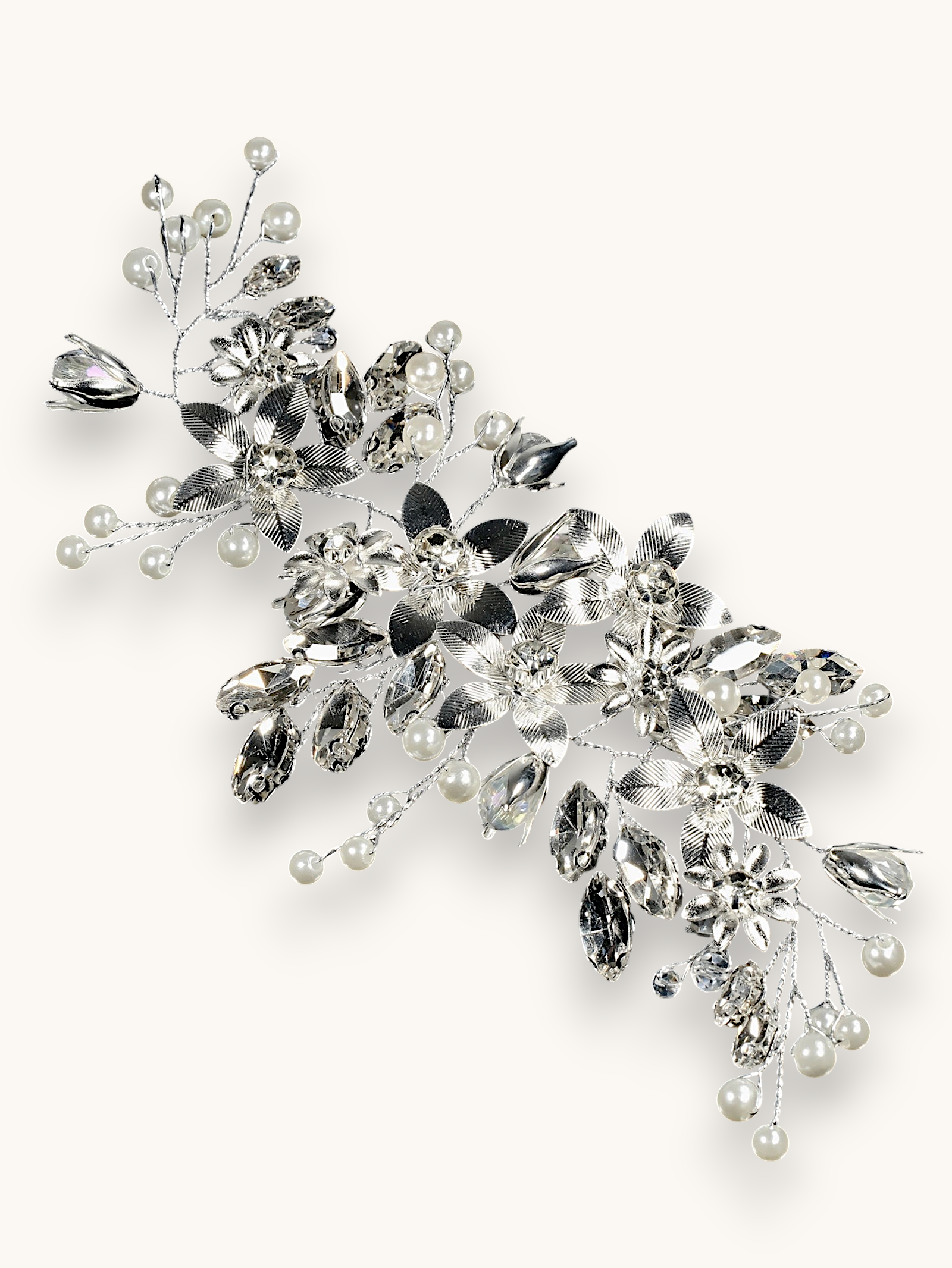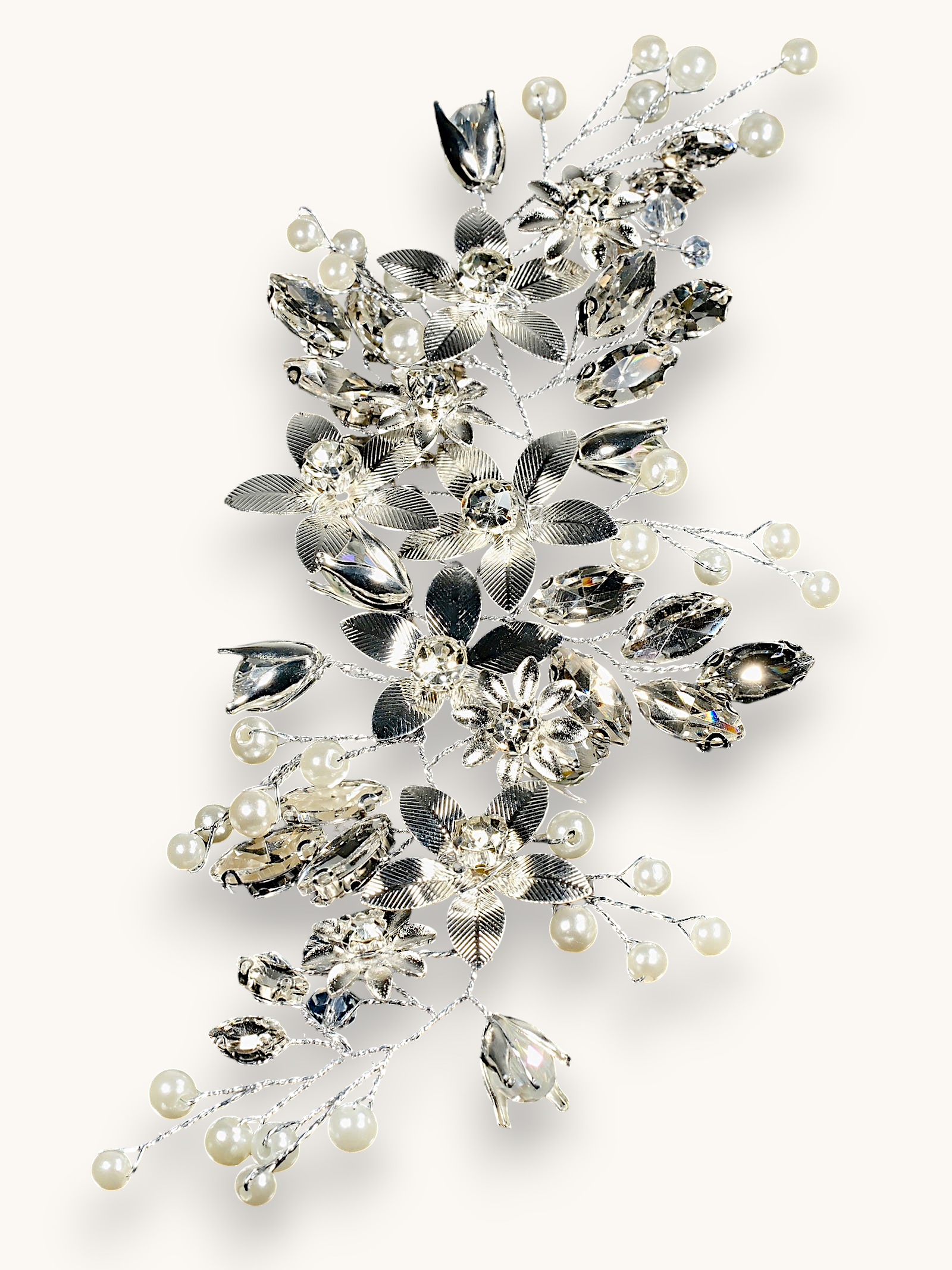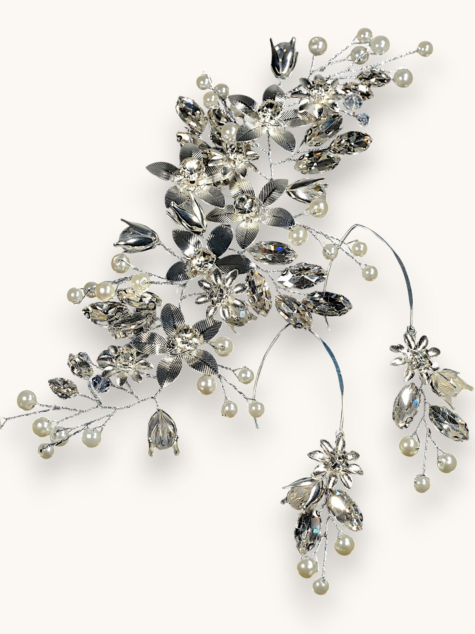 Šį sidabro spalvos papuošalų rinkinį sudaro auskarai ir plaukų aksesuaras (sagė), kurie dekoruoti dekoratyviniais kristalais bei gėlių motyvais. Abu aksesuarai pasižymi vientisu, šviesą atspindinčiu dizainu, todėl kartu sukuria harmoningą ir išbaigtą įvaizdį. Sagė suteikia šukuosenai šventinio spindesio, o derantys auskarai subtiliai pabrėžia veido bruožus.