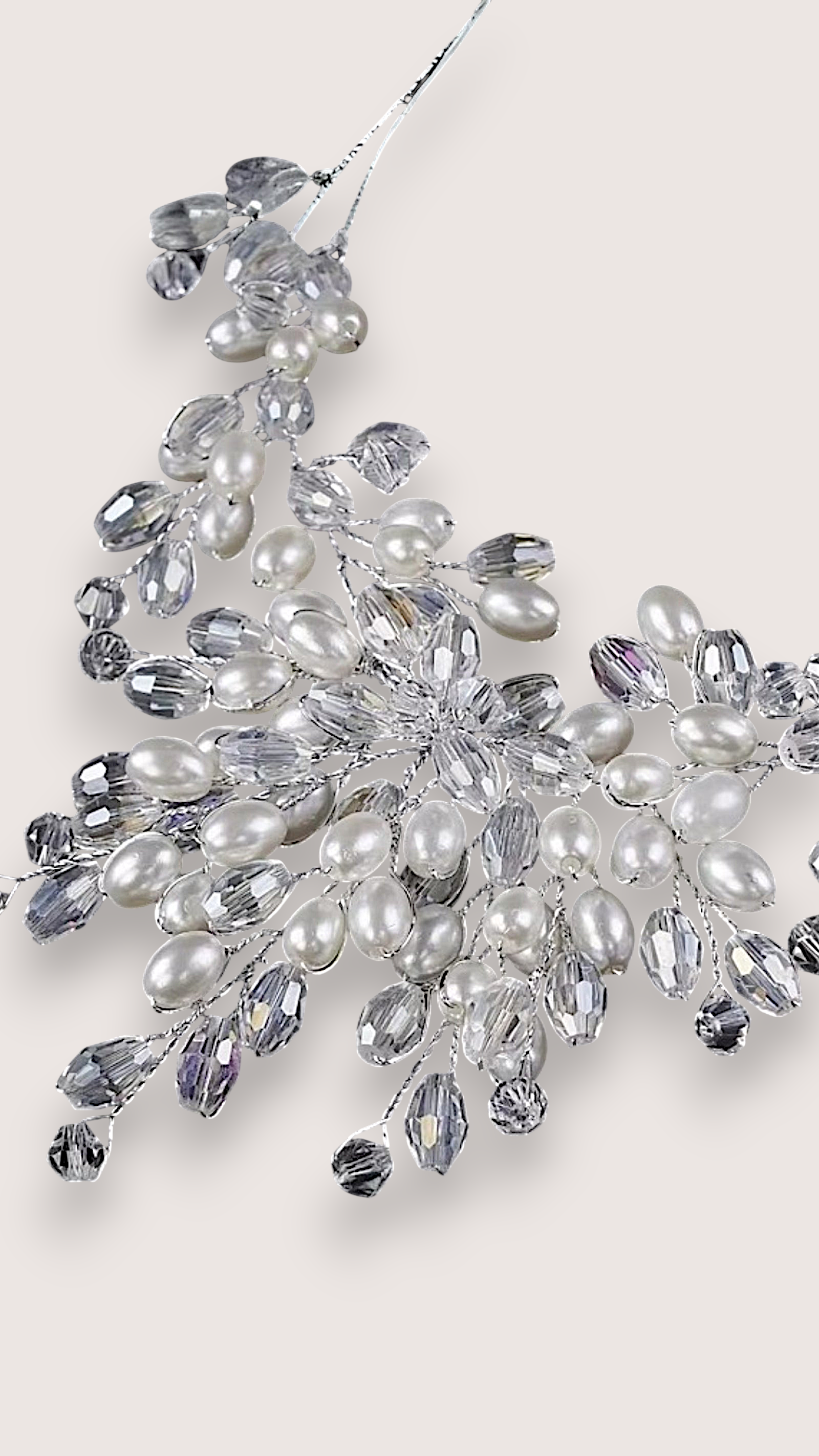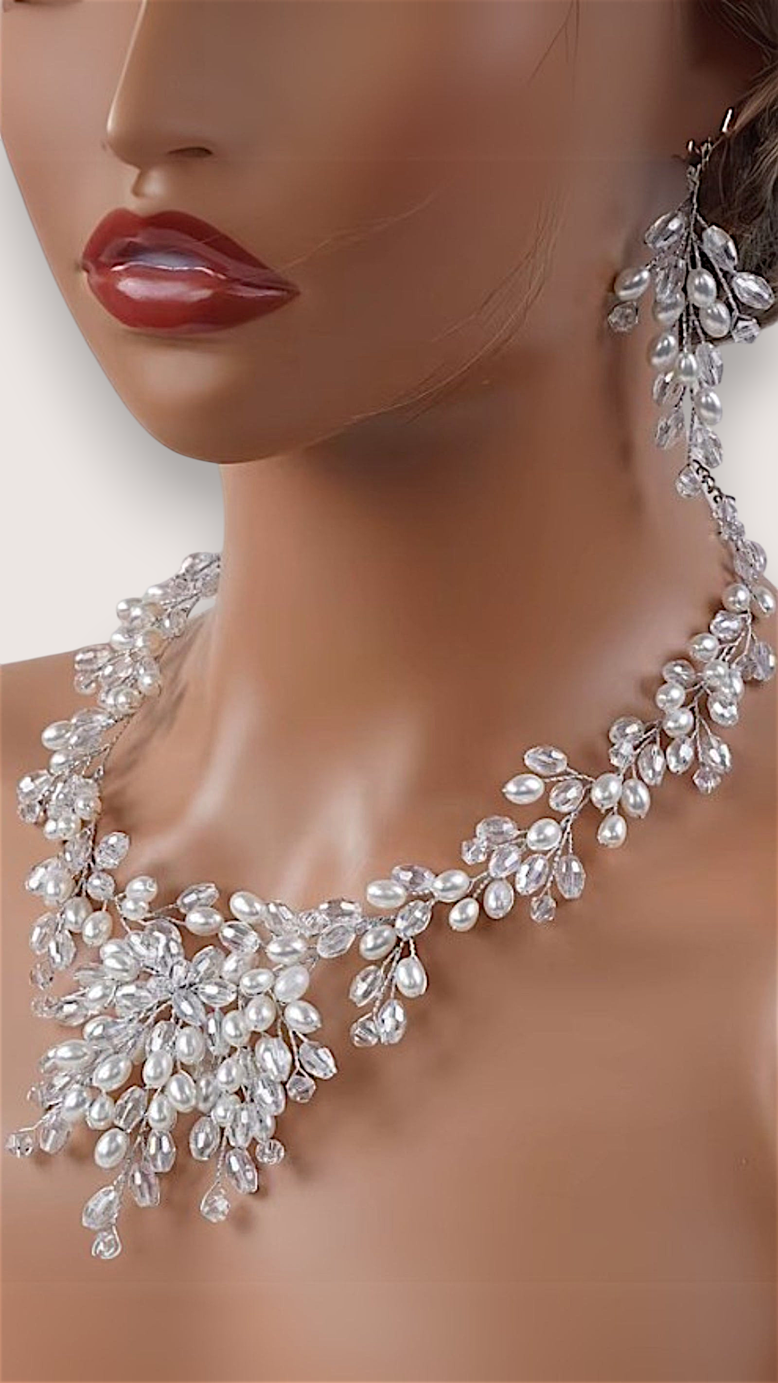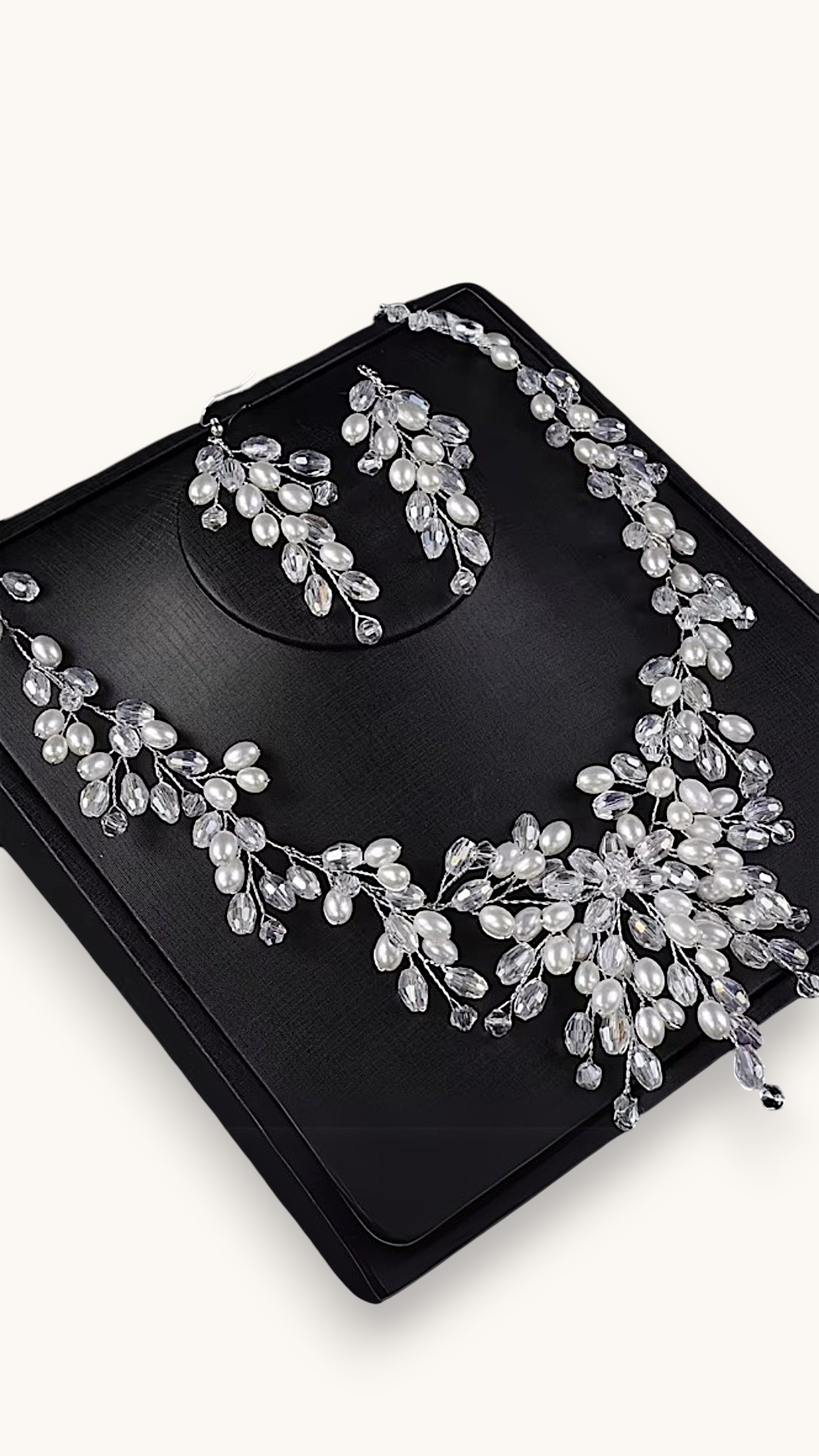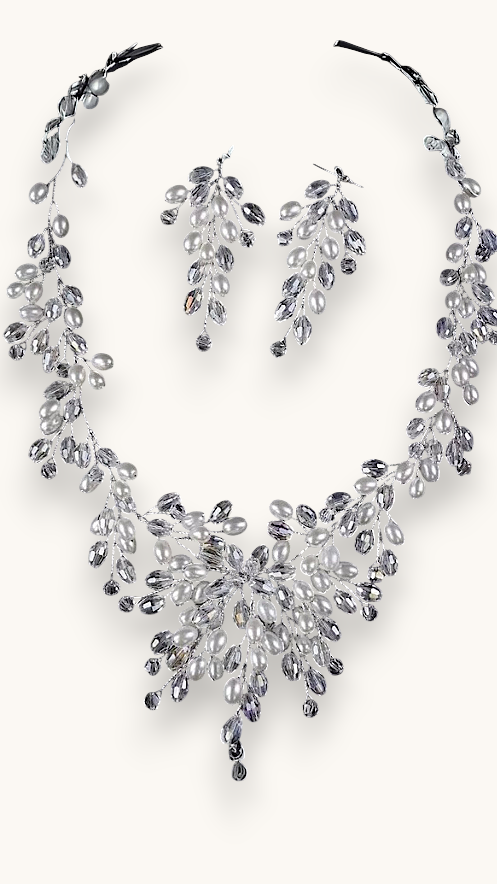Šį sidabro spalvos papuošalų rinkinį sudaro auskarai ir koljė, kurie dekoruoti dekoratyviniais kristalais bei perlais. Abu aksesuarai pasižymi vientisu, šviesą atspindinčiu dizainu, todėl kartu sukuria harmoningą ir išbaigtą įvaizdį. Koljė suteikia dekoltė sričiai šventinio spindesio, o derantys auskarai subtiliai pabrėžia veido bruožus.