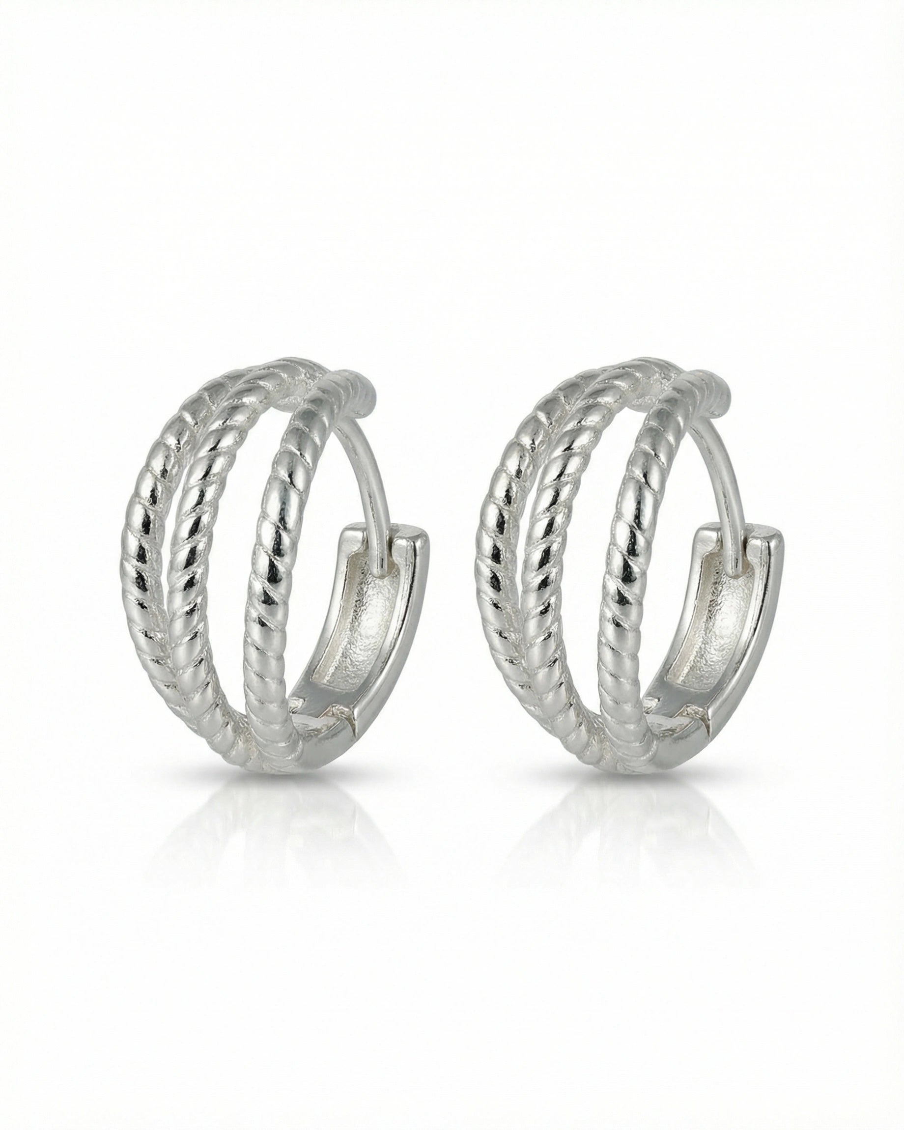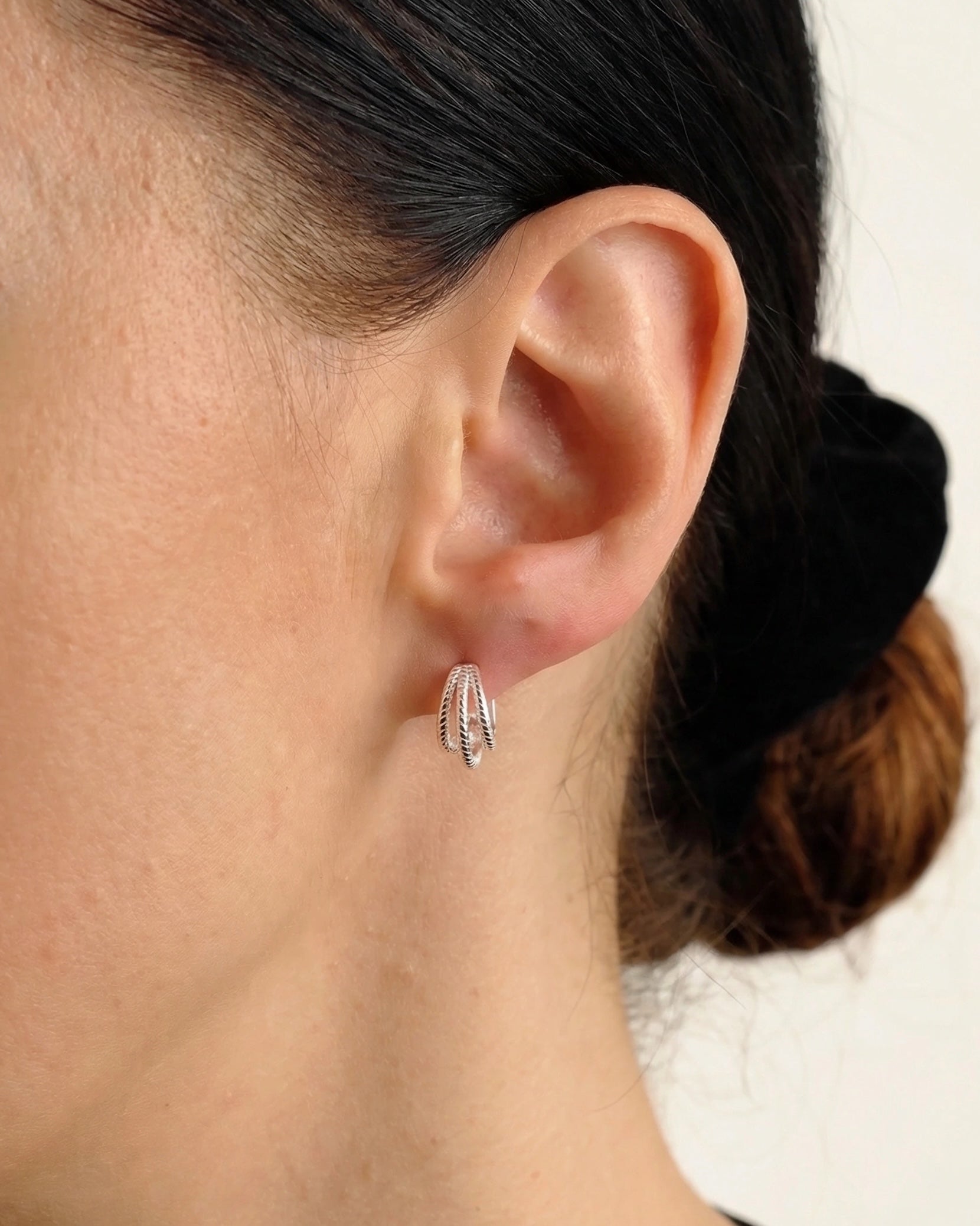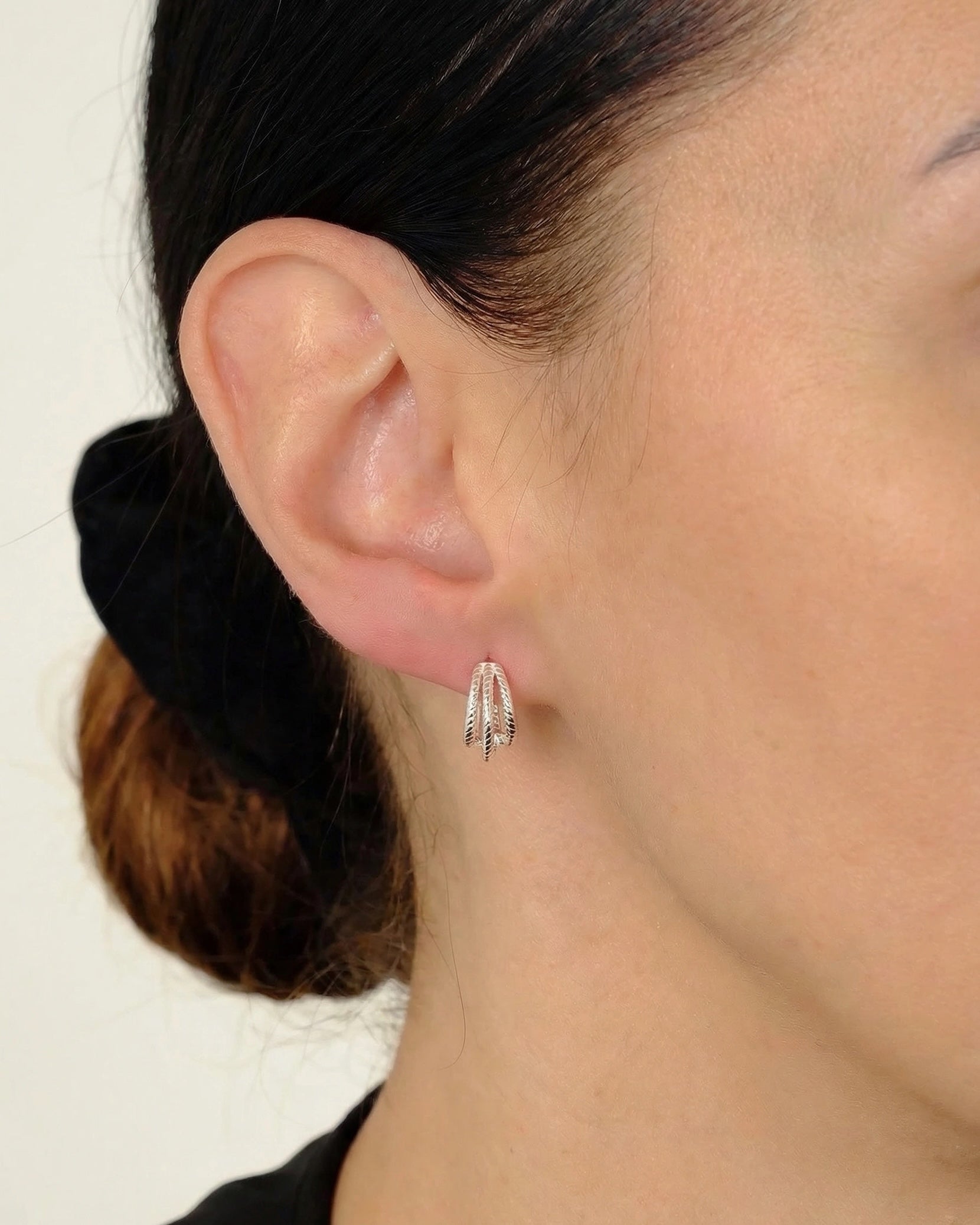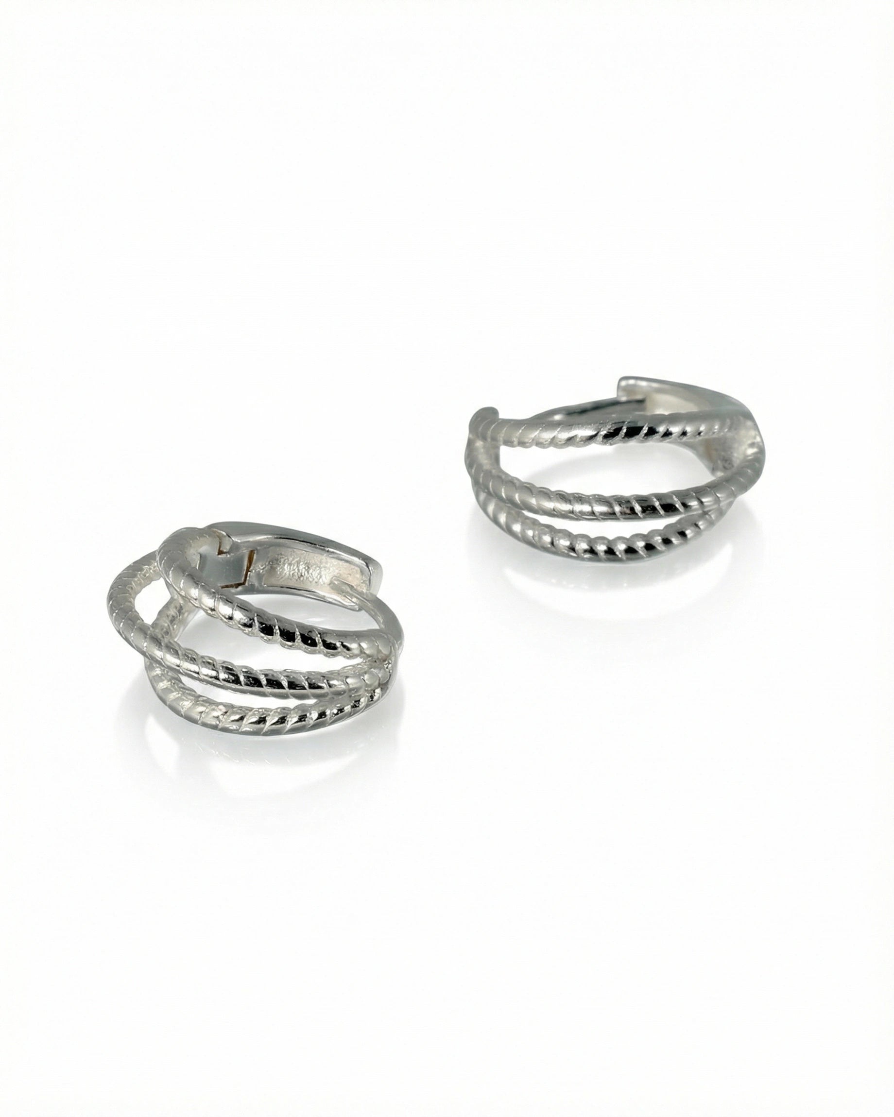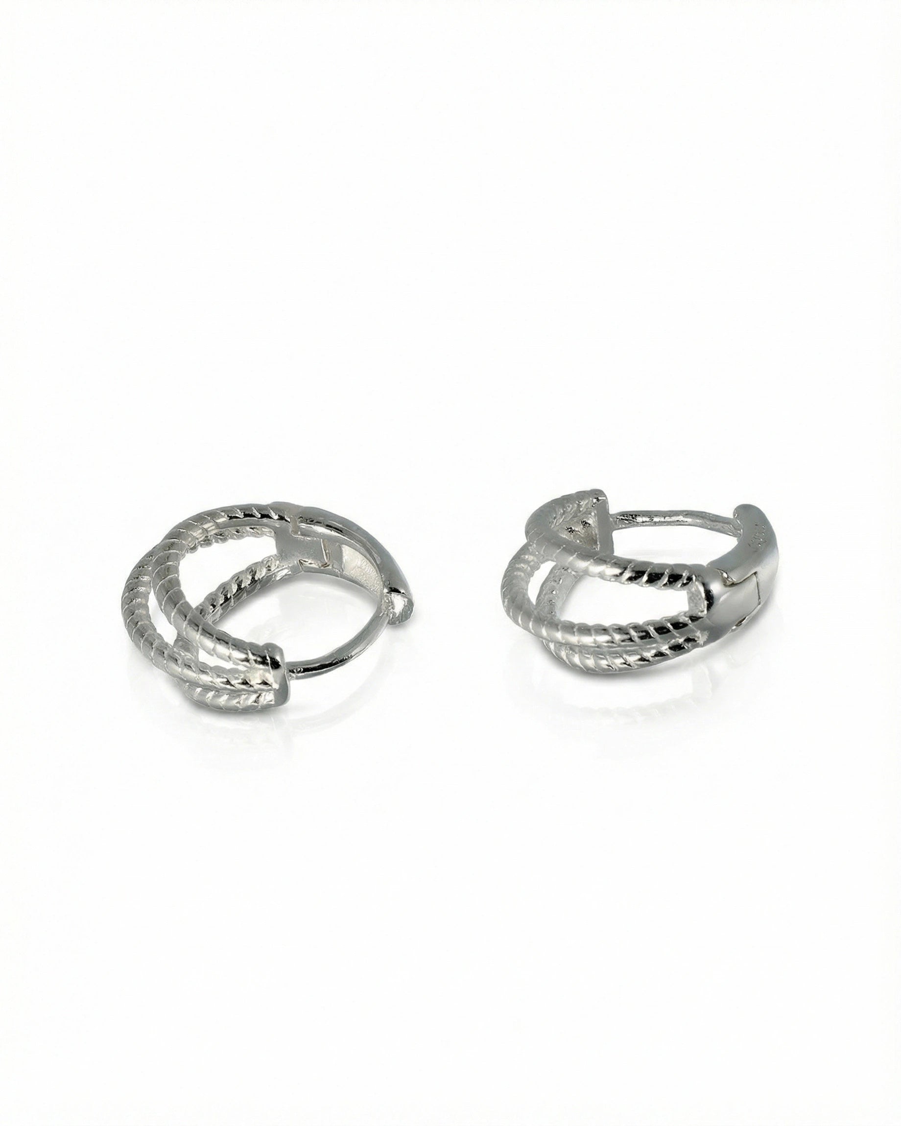 Šie 925 sidabro auskarai sujungia modernų minimalizmą ir subtilų meninį kruopštumą. Išskirtinis dizainas pasižymi trigubo lankelio forma, kurios paviršius papuoštas smulkiu virvutės raštu, suteikiančiu papuošalui tekstūros ir vizualinio gylio. Poliruotas sidabras švelniai atspindi šviesą, todėl auskarai atrodo gyvybingi ir elegantiški, puikiai tinkantys tiek kasdieniam biuro įvaizdžiui, tiek vakarinėms progoms.