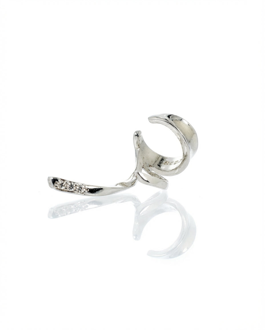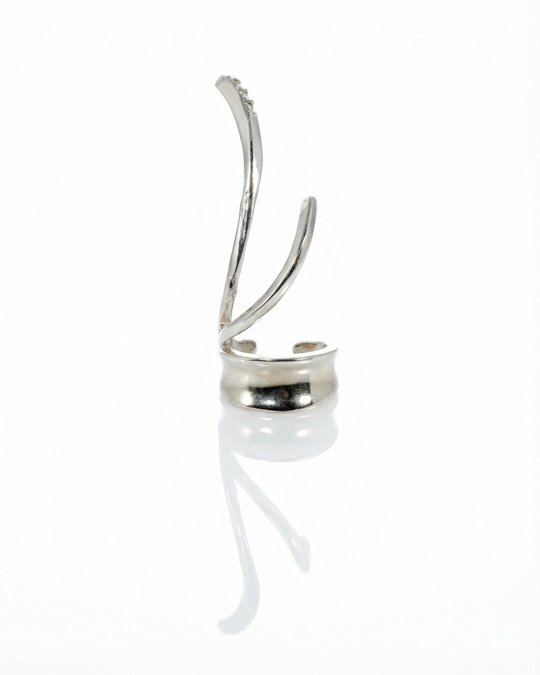 Elegantiškas 925 prabos sidabro „cuff“ tipo auskaras, pasižymintis unikalia, banguota dvigubo dizaino forma. Subtiliai įkomponuoti spindintys cirkonio akmenukai suteikia papuošalui modernumo ir prabangos pojūtį, leidžiantį sukurti išskirtinį įvaizdį net ir neturint papildomų vėrimų.