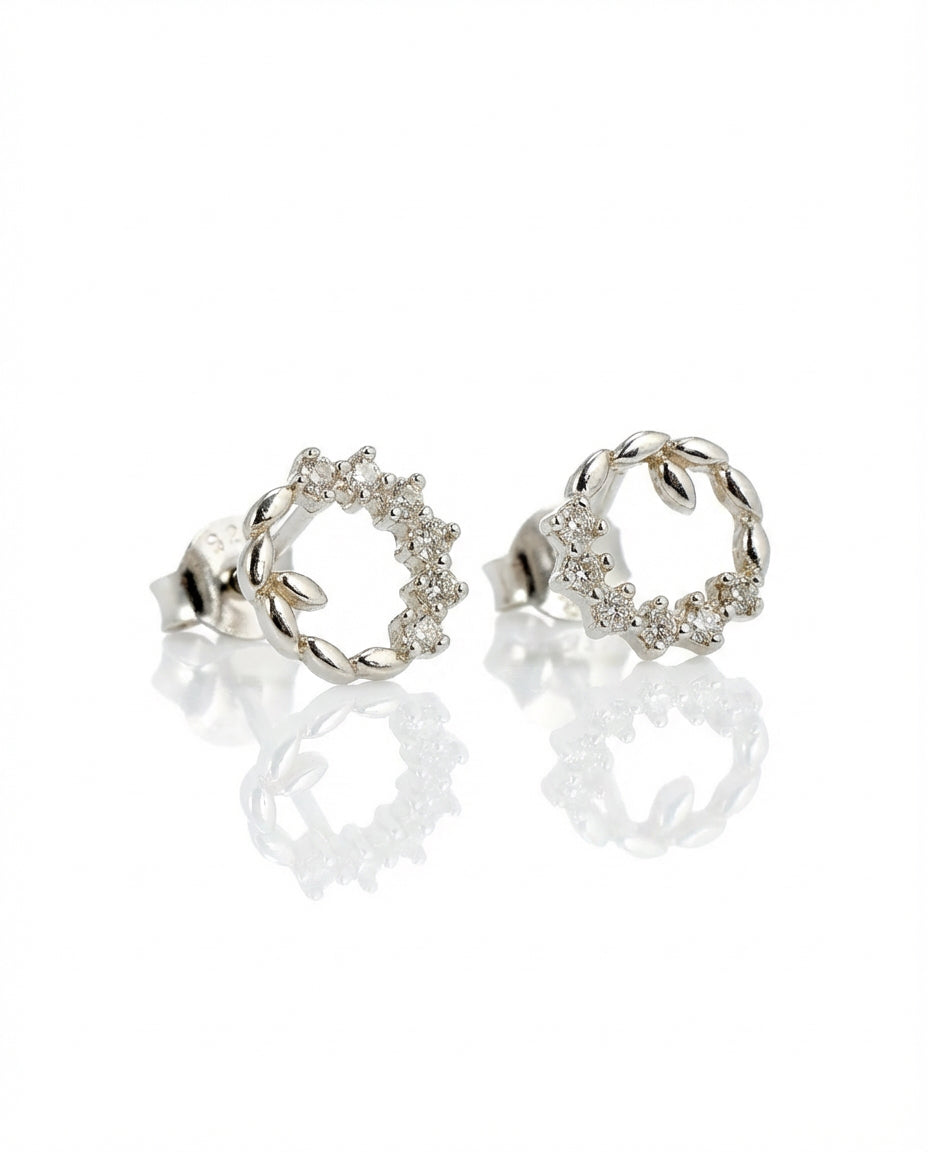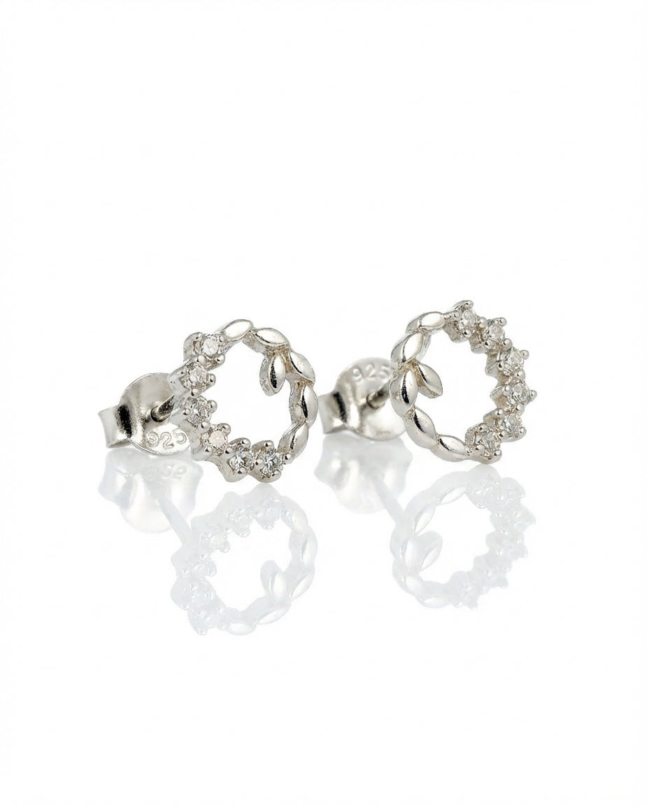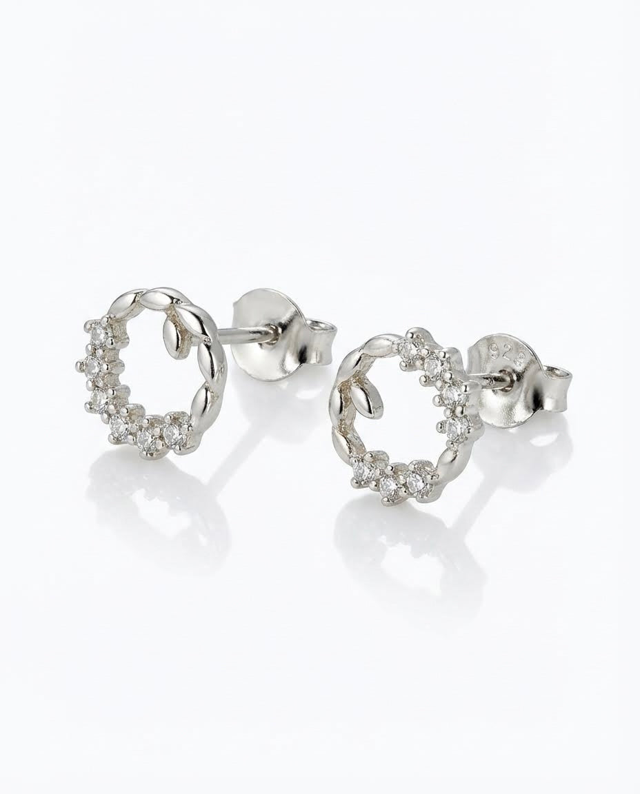 Šie 925 prabos sidabriniai auskarai-smeigtukai pasižymi subtiliu ažūriniu apskritimo dizainu, primenančiu romantišką gamtos vainiką. Pusė lankelio dekoruota spindinčiais cirkonio akmenukais, o kita pusė – elegantiškai susukta, suteikiant papuošalui faktūriškumo ir gylio. Tai lengvas ir rafinuotas aksesuaras, suteikiantis veidui subtilaus švytėjimo bei papildantis tiek kasdienį, tiek šventinį įvaizdį.